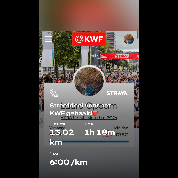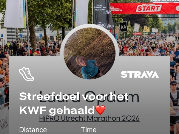 Hoi! Ik ben Laura, 22 jaar en veel bezig met sport. Hardlopen is een nieuwe hobby van mij geworden en het leek mij mooi om dit te combineren met een goed doel. Binnen mijn opleiding tot verpleegkundige zie ik van dichtbij wat het effect is van kanker op de mens en zijn omgeving. Ik wil graag bijdragen aan de onderzoekers van het KWF om zo samen kanker tegen te gaan.