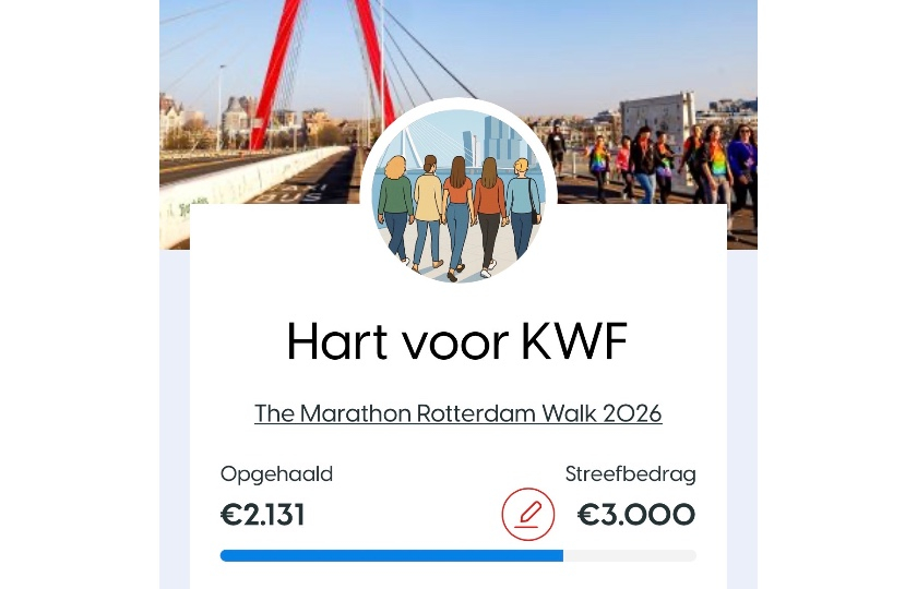 Wij wandelen tegen kanker tijdens The Marathon Rotterdam Walk 2026. Wil jij ons sponsoren? Daarmee zorgen we samen met KWF voor een beter leven met en ná kanker. Dat is heel hard nodig, want iedereen krijgt ooit te maken met kanker. Wij wandelen omdat wij hopen dat er genoeg geld opgehaald kan worden voor onderzoek, zodat kanker uiteindelijk voor niemand meer dodelijk zal zijn!