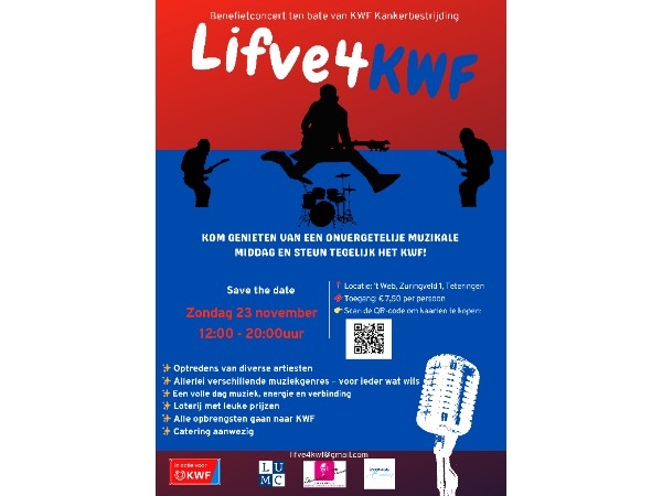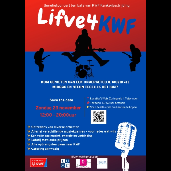 Wij komen in actie om geld op te halen voor kankeronderzoek. Geld dat heel hard nodig is, want maar liefst 1 op de 2 mensen in Nederland krijgt de diagnose kanker. Zoals zovelen zijn wij ook persoonlijk getroffen door deze ziekte: Arthur's vrouw nu voor de tweede keer, Inge heeft het aan den lijve mogen ondervinden en de afgelopen jaren de strijd mogen strijden. Sponsor ons of bezoek ons Benefietconcert op zondagmiddag 23 november 2025 in 't Web in teteringen en help KWF met de financiering van belangrijk onderzoek naar kanker. Namens ons en KWF: dankjewel!