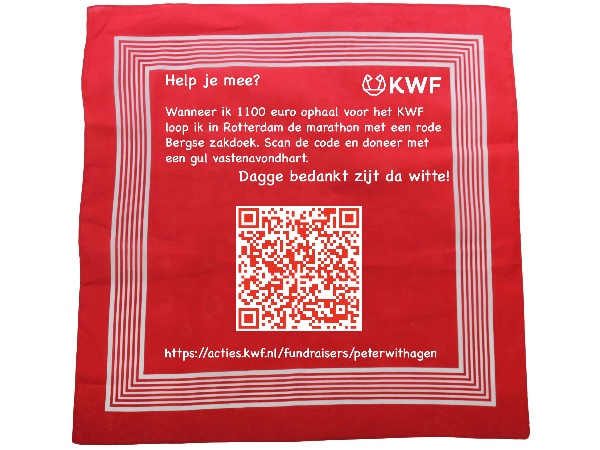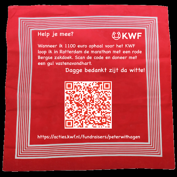 Opnieuw ga ik de marathon van Rotterdam lopen. Dat doe ik graag voor een goed doel, het KWF. Iedereen kent wel een voorbeeld uit zijn nabijheid om te weten waarom het KWF belangrijk onderzoek verricht, want 1 op de 2 mensen krijgt ooit te maken met de diagnose kanker. Help je mee door mij te sponsoren? Het is voor mij een enorme stimulans om toch te gaan trainen als het koud of nat is. Om door te zetten tijdens de marathon tot aan de streep omdat ik weet dat ik het ergens voor doe. Sponsor mij en help KWF met de financiering van belangrijk onderzoek naar kanker. Namens het KWF en mijzelf: dankjewel!