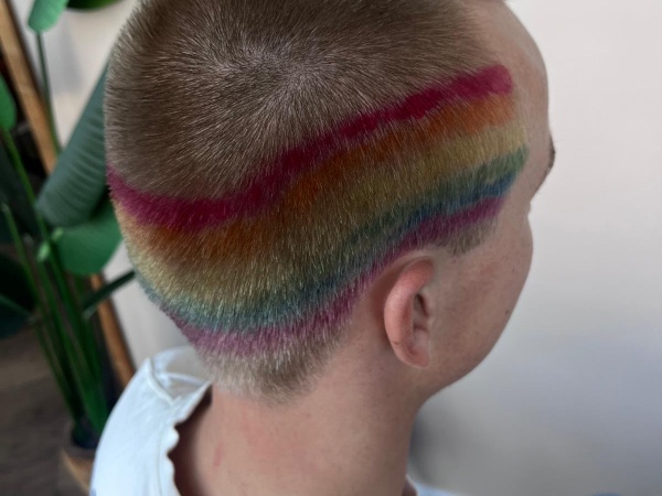 €2.000 → donkergroen haar + buzzcut