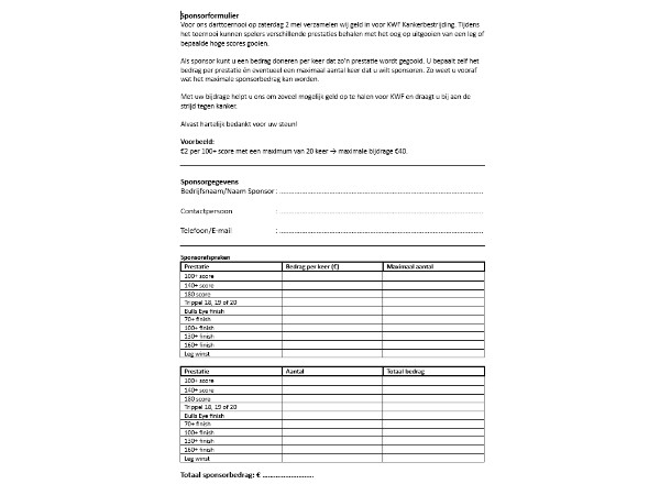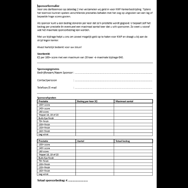 Om sponsors te trekken en inkomsten te genereren door bepaalde prestaties te halen, heb je natuurlijk een sponsorformulier nodig die je kan aanbieden aan bedrijven of sponsors die willen doneren. Hier mag natuurlijk vorm aan gegeven worden maar een leuk opzetje of concept is dit wel om zo aan te pakken!
