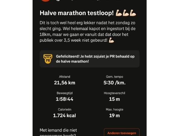 Met nog een kleine 3 weken te gaan, afgelopen donderdag een goede testrun gerend van 21,5km!