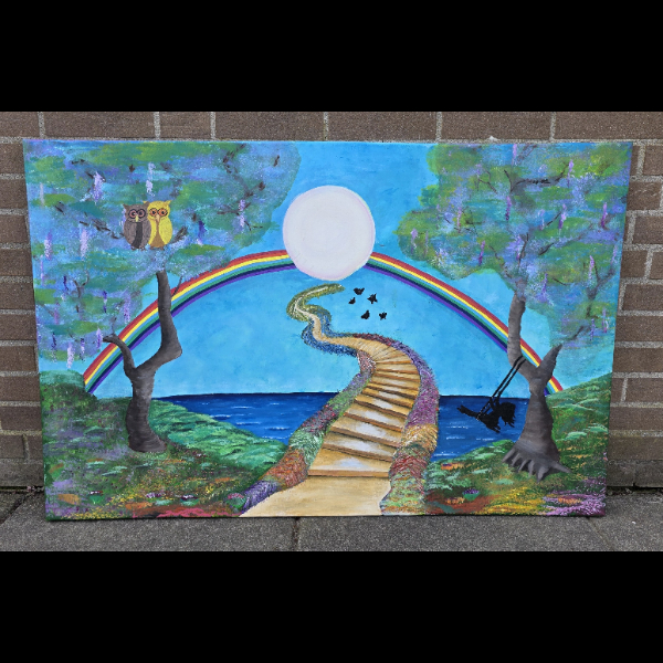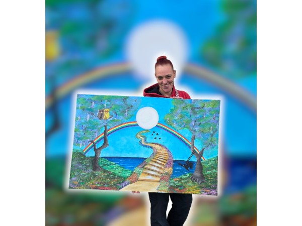 Vanuit diezelfde inspiratie heb ik in het Tragel Shop atelier Eeckenstein mijn schilderij “De Trappenhemel” ontworpen (Acryl op Canvas 110 x 75 cm). Een werk dat recht uit mijn hart komt. Ik draag dit schilderij op aan iedereen die de strijd tegen kanker voert of heeft moeten verliezen. Daarom zet ik mijn creativiteit in om geld in te zamelen voor KWF Kankerbestrijding. Elke donatie, groot of klein, helpt mee aan belangrijk onderzoek en aan een toekomst met minder kanker en meer leven.