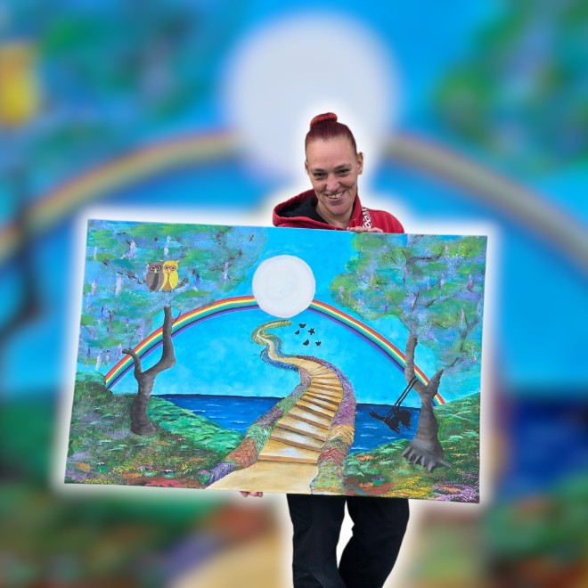 In de herdenkingshoek van de zorgorganisatie waar ik woon, heb ik een grote muurschildering gemaakt: een plek vol betekenis en kleur. De regenboogkleuren staan symbool voor alles wat het leven mooi maakt. Rood is voor liefde, geel is voor blijdschap en geluk, groen is voor leven en groei, oranje voor plezier, paars voor gezondheid, blauw voor kracht. En de vlinders? Die staan voor een vrij gevoel. Want elke keer als ik een vlinder zie, voel ik me vrij.