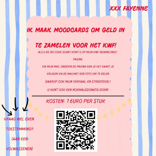 Stuur een mailtje naar acties@kwf.nl of bel tijdens kantooruren naar (0900) 2020041. We helpen je graag.